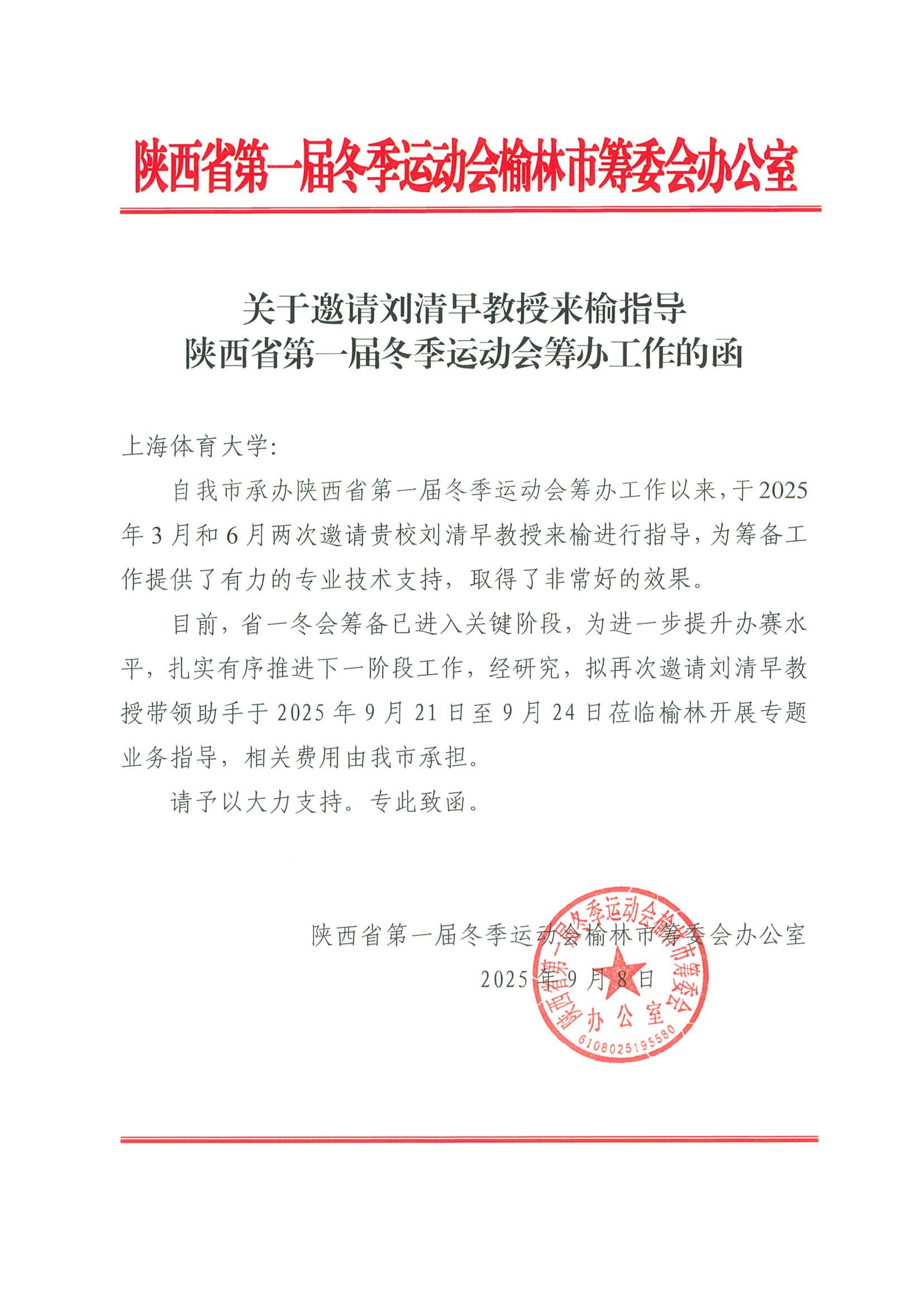 来榆指导陕西省第一届冬季运动会筹办工作的函