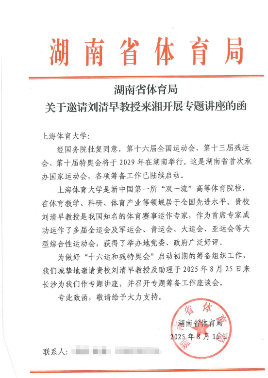 湖南省体育局邀请刘教授来湘开展专题讲座的函