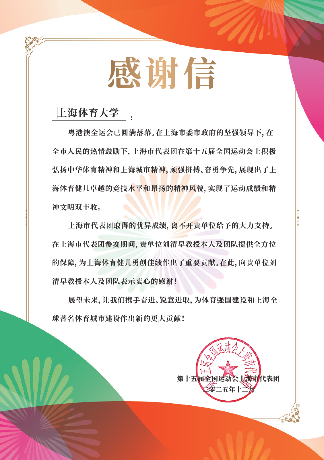 第十五届全国运动会上海市代表团感谢信